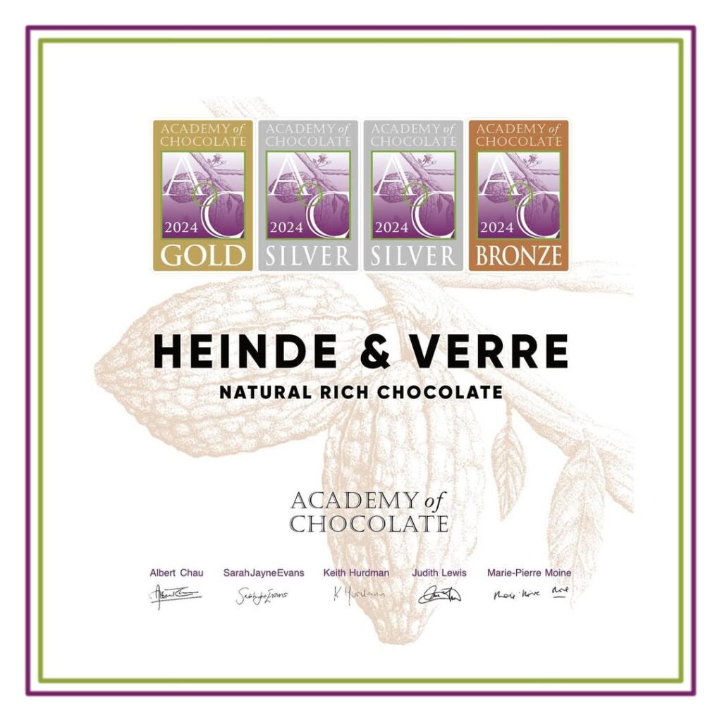 Heinde&Verre の4フレーバーのチョコレートバーが、Academy of Chocolate Chocolate (アカデミー・オブ・チョコレート)の賞を受賞しました。チョコレートバーの箱の裏面を見て頂くと受賞のマークがございます。Heinde&Verreの特別なLimitedバーの2商品も含めて評価して頂きました。